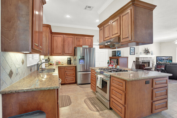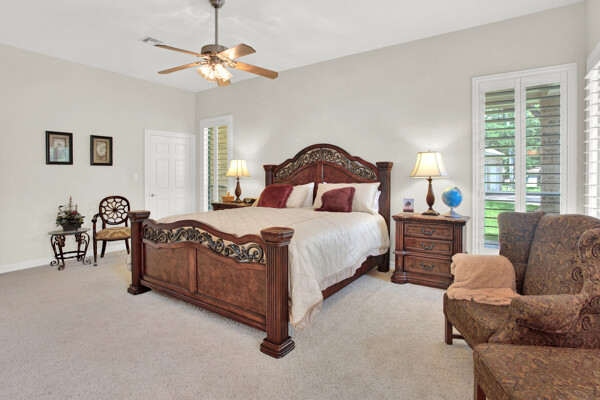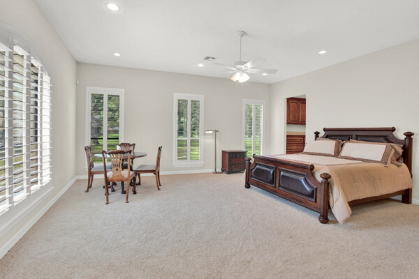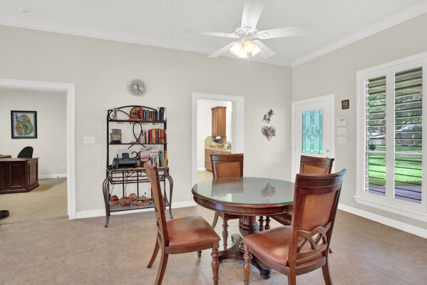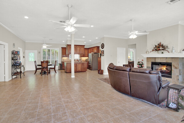 The open-concept floor plan seamlessly connects the living spaces, creating an ideal environment for entertaining guests or spending quality time with loved ones. The spacious living room boasts soaring ceilings, a cozy fireplace, and large windows with plantation shutters that allow privacy and viewing.